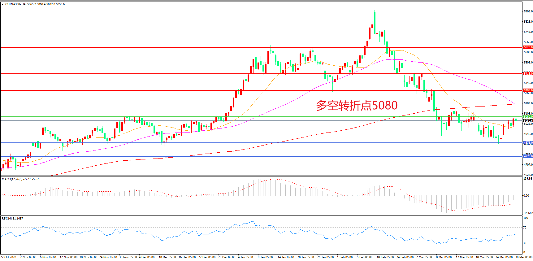 4小时图看,沪深300回踩4875后震荡拉升,短期走势有所企稳,5080成为短期多空分水岭,21周期均线形成下方支撑,MACD绿柱缩短,RSI指标走平,日内延续震荡概率较大。