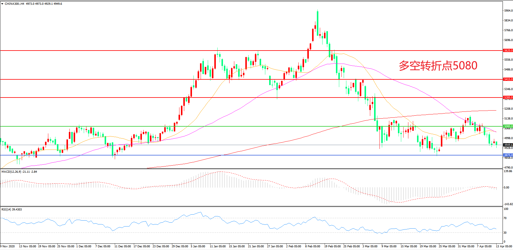4小时图看,沪深300延续低位震荡,整体表现相对低迷,均线系统粘合成为上方阻力,4875成为下方支撑,MACD绿柱增加,RSI指标走平,日内延续震荡概率较大。