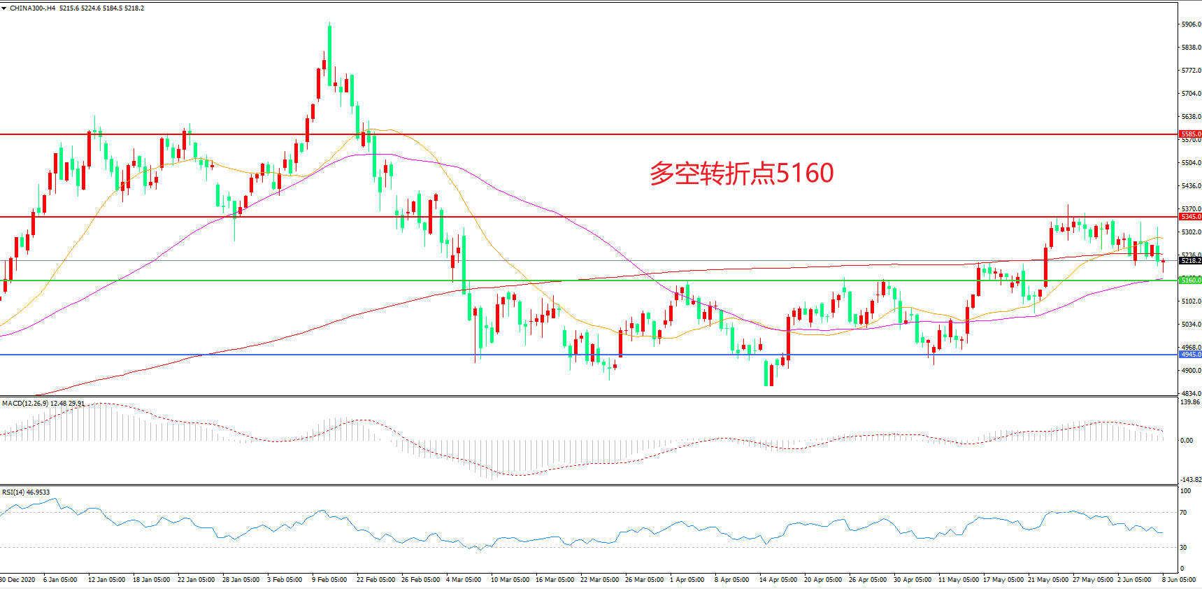 4小时图看,沪深300延续高位震荡,多空博弈较为均衡,5345成为上方阻力,55周期均线成为下方支撑,MACD红柱缩短,RSI指标走平,日内延续震荡概率较大。