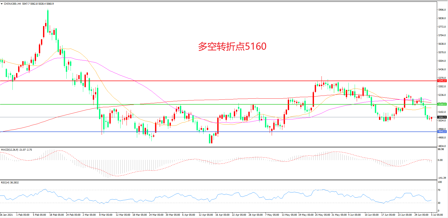 4小时图看,沪深300延续低位震荡,整体波幅不大,均线系统走平形成上方阻力,5160成为多空分水岭,MACD绿柱增加,RSI指标向上,日内延续震荡概率较大。