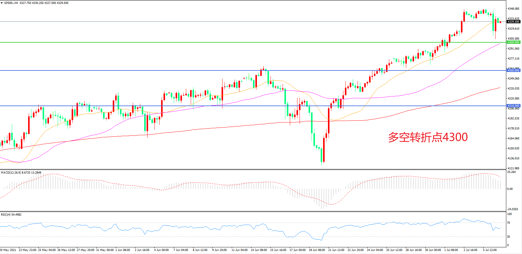 4小时图看,标普500连续拉升后高位回调,短线涨势放缓,但4300支撑依然稳固,均线系统呈多头排列,MACD红柱减少,RSI指标走平,日内震荡上行概率较大。