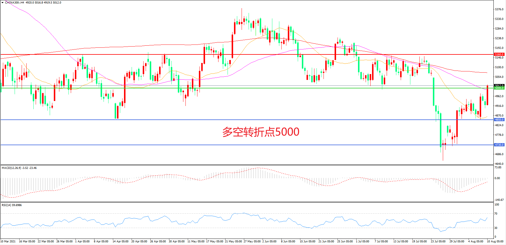 4小时图看,沪深300以4850为依托大幅反弹,短线行情回暖,5000点阻力被顺势突破,MACD绿柱缩短,RSI指标走平,日内震荡上行概率较大。