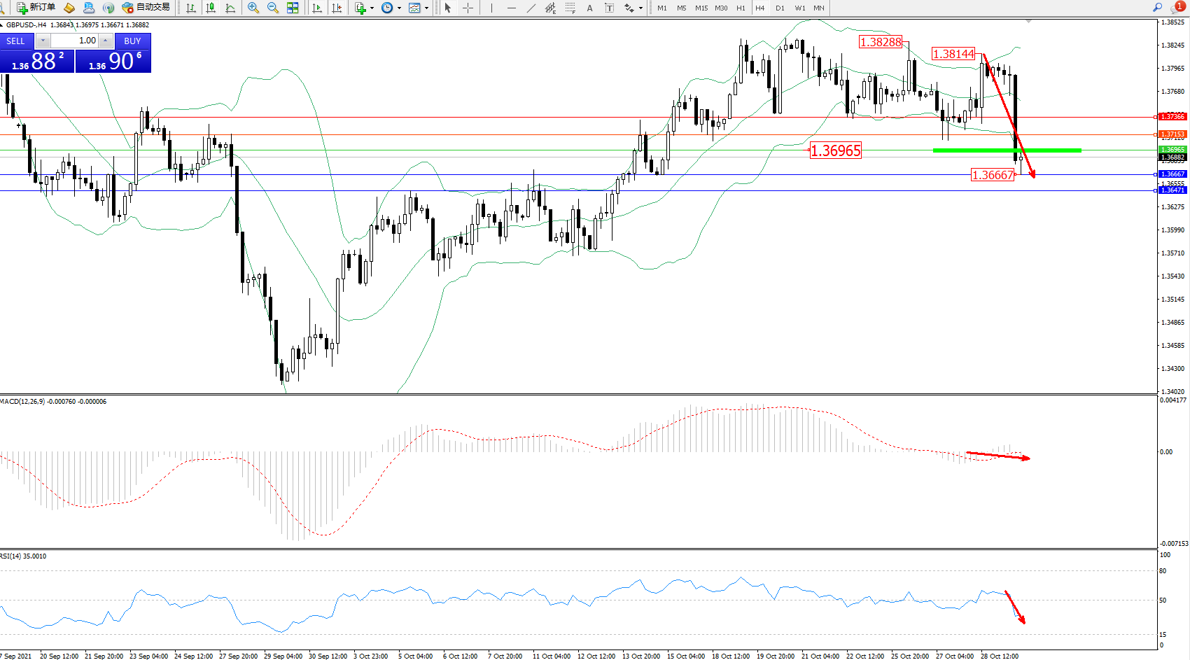 交易策略:1.36965下方看跌,目标1.36667、1.36471