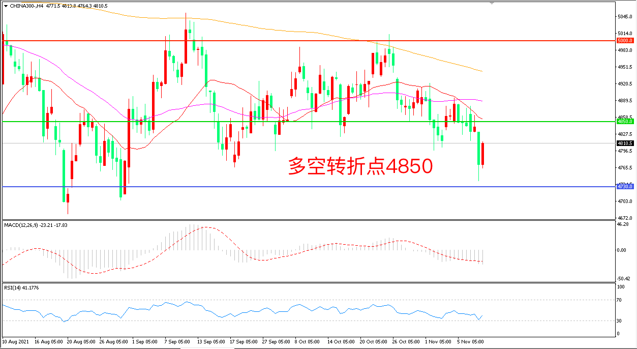 4小时图看,沪深300连续震荡后破位大跌,疲弱走势明显,均线系统成为上方阻力,4850成为多空分水岭,MACD绿柱增加,RSI指标走平,日内震荡下行概率较大。