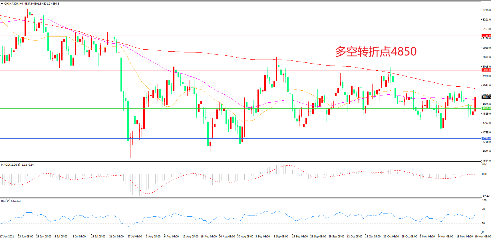 4小时图看,沪深300长阳拉升突破4850,短期走势有所回暖,200均线成为上方阻力,21周期均线成为下方支撑,MACD红柱缩短,RSI指标向上,日内震荡向上概率较大。