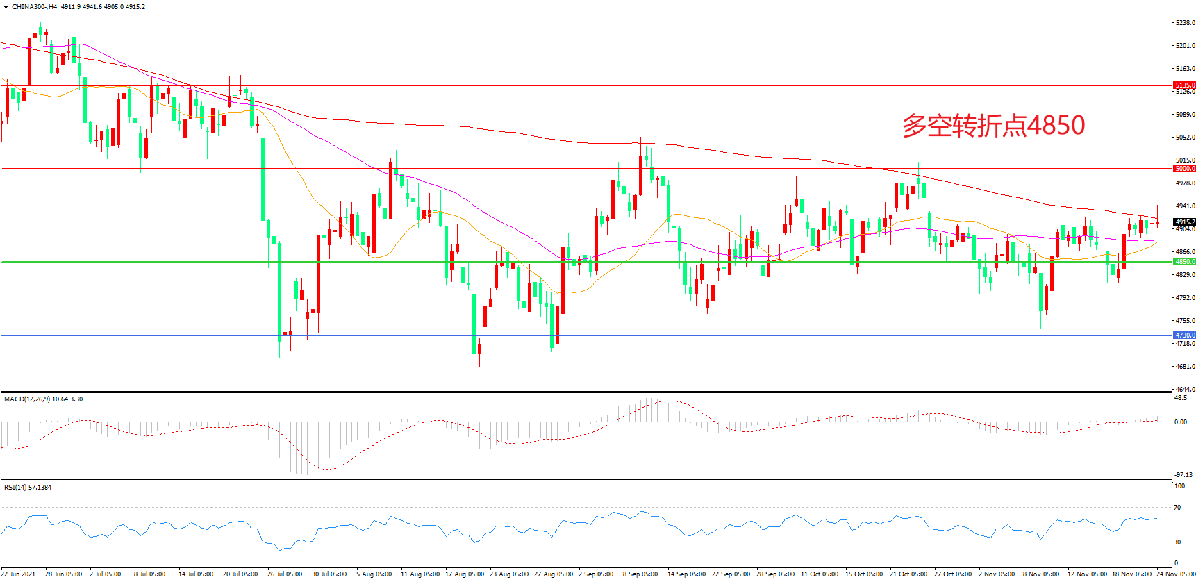 4小时图看,沪深300低点逐渐拉升,整体走势偏强,200周期均线成为阻力,短周期均线上穿形成金叉,MACD红柱增加,RSI指标走平,日内震荡向上概率较大。