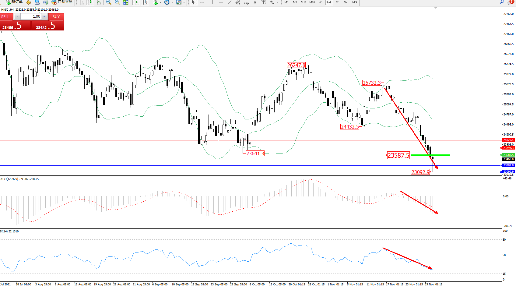 技术点评:空头动力延续布林带指标下轨附近持续下探,低位抵达23092位置后开始急速回升,但短期依旧未见最终止步迹象,布林带指标呈张口走势后开始收口下行,MACD指标处于空头区域维持震荡持续下行,RSI指标处于空头区域维持整理持续下探;