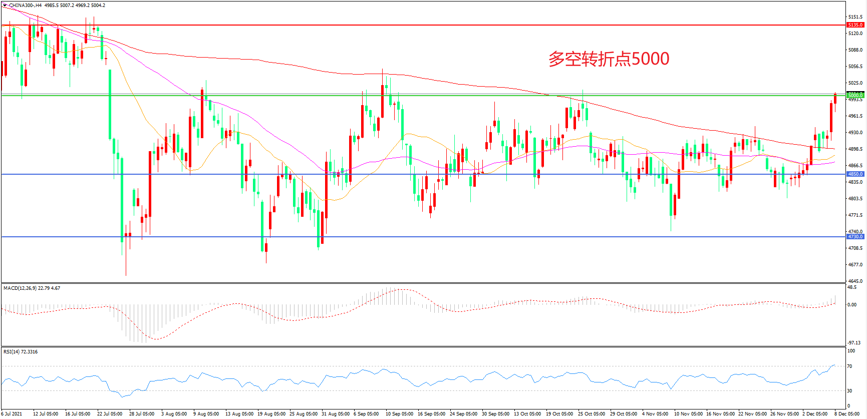 周三(12月8日),降准利好情绪继续发酵,三大指数集体走强,沪深300大幅拉升,收报5004点。两市合计成交11.1万亿元,北向资金净买入96.85亿元。目前货币宽松的空间已经打开,流动性将逐步趋于宽松,金融、白酒蓝筹权重等支撑指数拉升,但成交量今日没有明显放大,不排除短期回踩后继续走高。