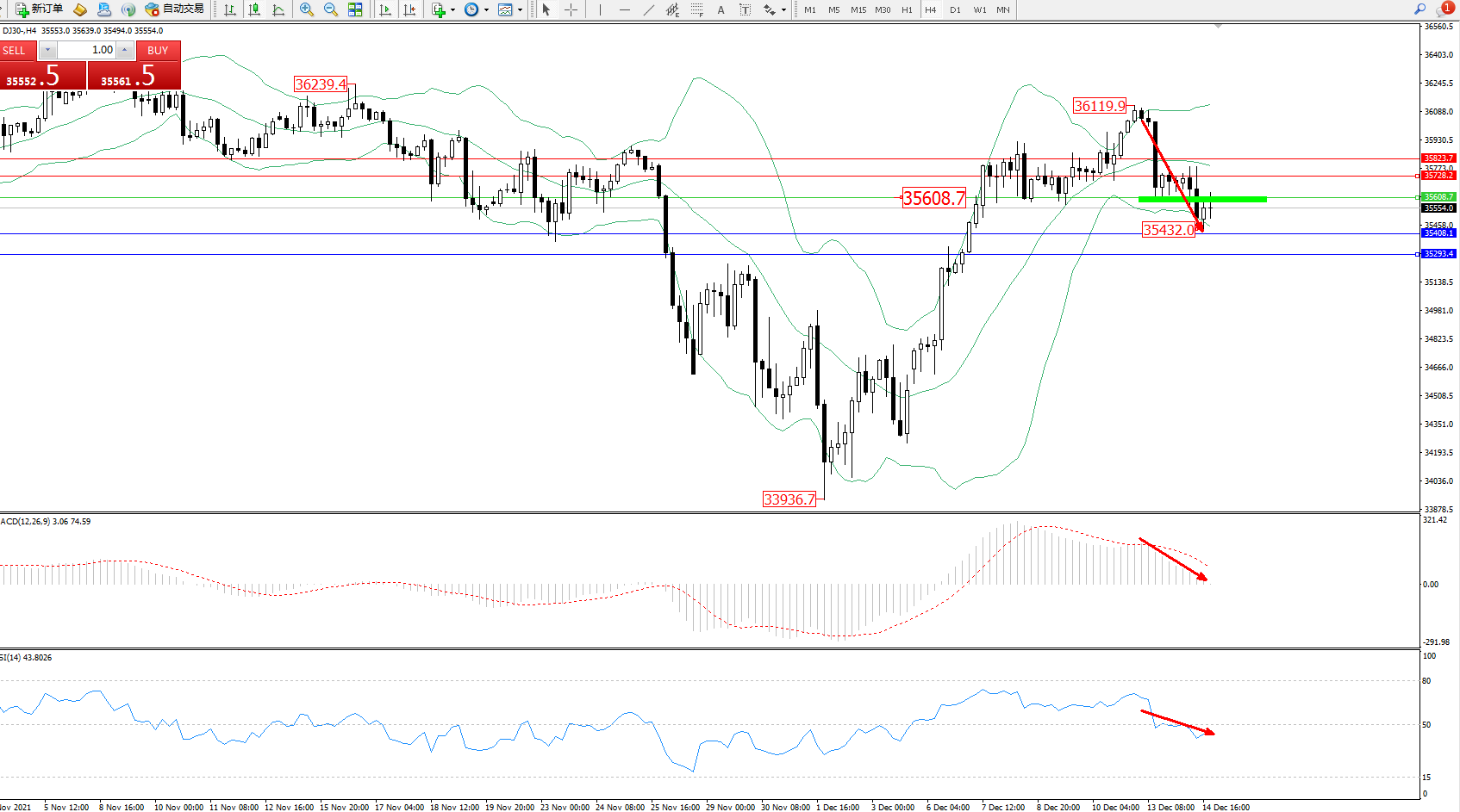 技术点评:多头动力延续布林带指标通道中上轨区间持续震荡上扬,高位抵达36119位置后遇阻回撤,呈阶梯式震荡缓慢下行,抵达35432位置后开始整理,短期高位回撤走势或将持续,布林带指标呈张口走势持续中,MACD指标处于多头区域维持整理缓慢下行至0轴线附近徘徊,RSI指标处于50均衡线下侧弱势整理中;