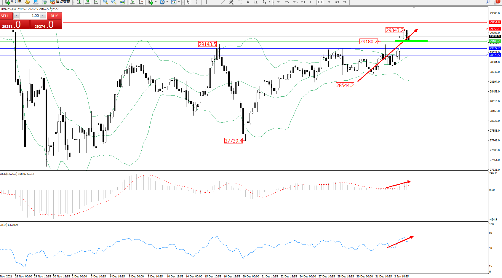 日经225指数1月4日(周二)收盘上涨493.29点,涨幅1.71%,报29285.00点。日本新冠疫苗累计接种逾2亿剂,达2.013亿剂,其中78.5%的人口已接种第二剂疫苗。周二日本新增奥密克戎变异株感染病例超过1000例。日本首相岸田文雄:将开始为所有老年人接种加强针。将继续保持针对奥密克戎变异株的边境管制。将在2月份的某个时候开始使用辉瑞的新冠口服药物。将为扶持初创企业推出5年计划。为了应对新冠肺炎疫情,决定在本月晚些时候国会召开之前不出国。今年将尽可能与海外国家领导人进行面对面会谈。