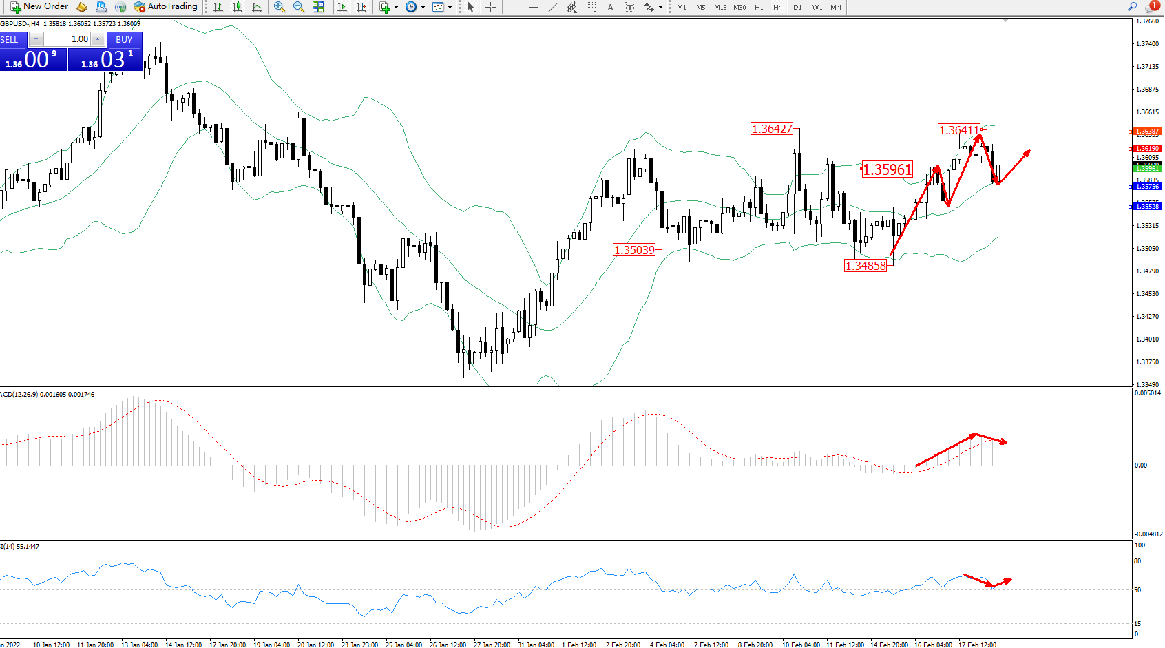 交易策略:1.35961上方看涨,目标1.36190、1.36387