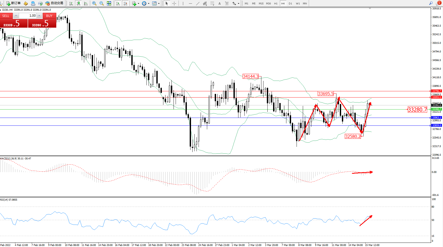 道琼斯指数3月15日(周二)收盘上涨600.49点,涨幅1.82%,报33545.73点;美股收盘,三大股指高开高收,美国联邦公开市场委员会(FOMC)可能在本次会议上加息25个基点,此前美联储主席鲍威尔已经作出暗示。预计之后的利率路径将会更具不确定性,而这很大程度上将取决于美联储各委员对于高油价带来的冲击性影响的解读。如果成员们主要认为通胀将在明年自行消退,通胀预期仍然良好锚定,与市场定价的7次加息相比,点阵图将显示更为温和的路径。然而,如果委员态度更为鹰派,对通胀脱锚的担忧加剧,点阵图将可能暗示7次加息。我们认为前者更有可能发生。