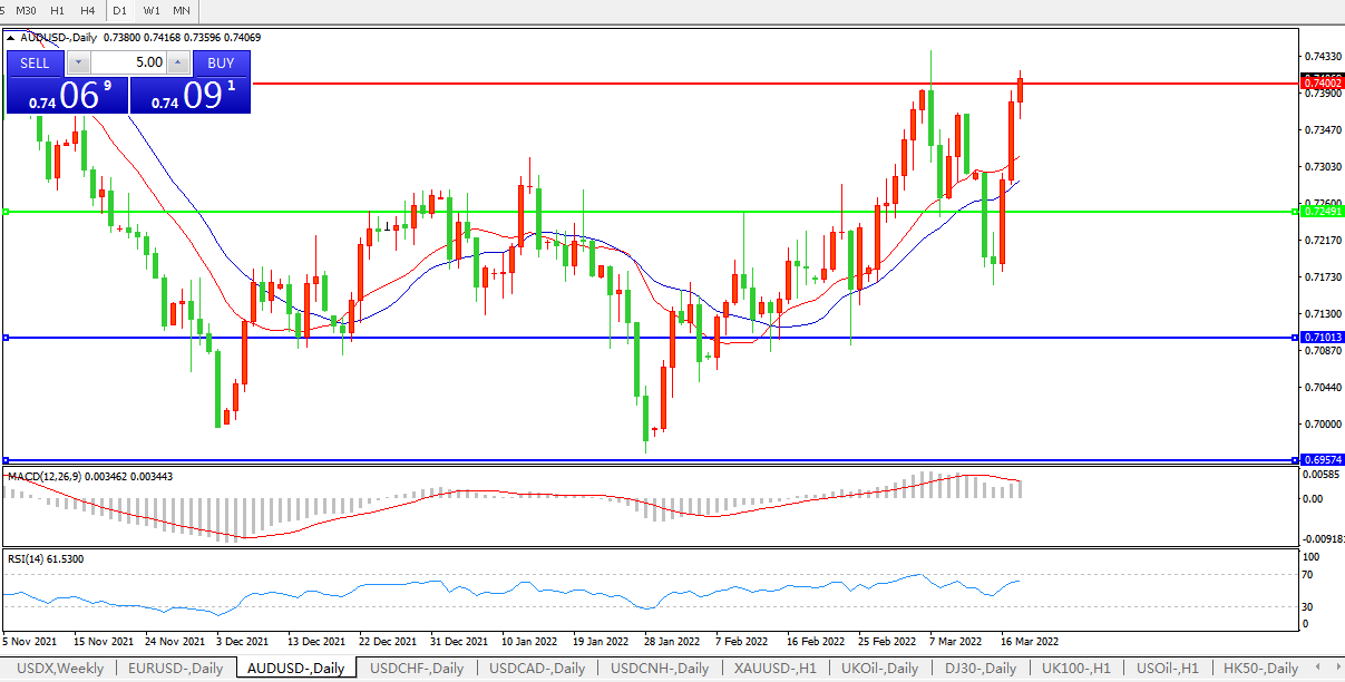 技术面简析:日图均线呈多头排列,汇价快速拉升,MACD运行于0轴上且量能小幅缩量,RSI延续走高,预计汇价大概率将进一步上行。