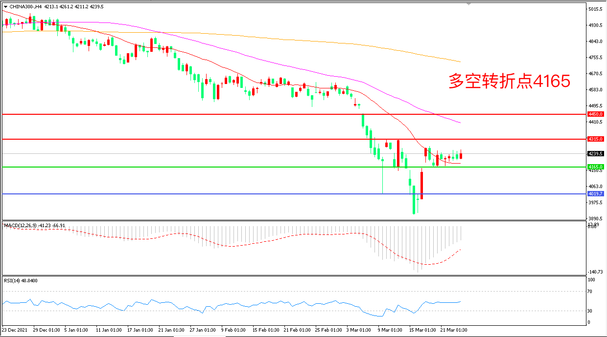 4小时图看,沪深300以4165为依托展开整理,短期波幅不大, MACD绿柱缩短,RSI指标走平,日内延续震荡概率较大。