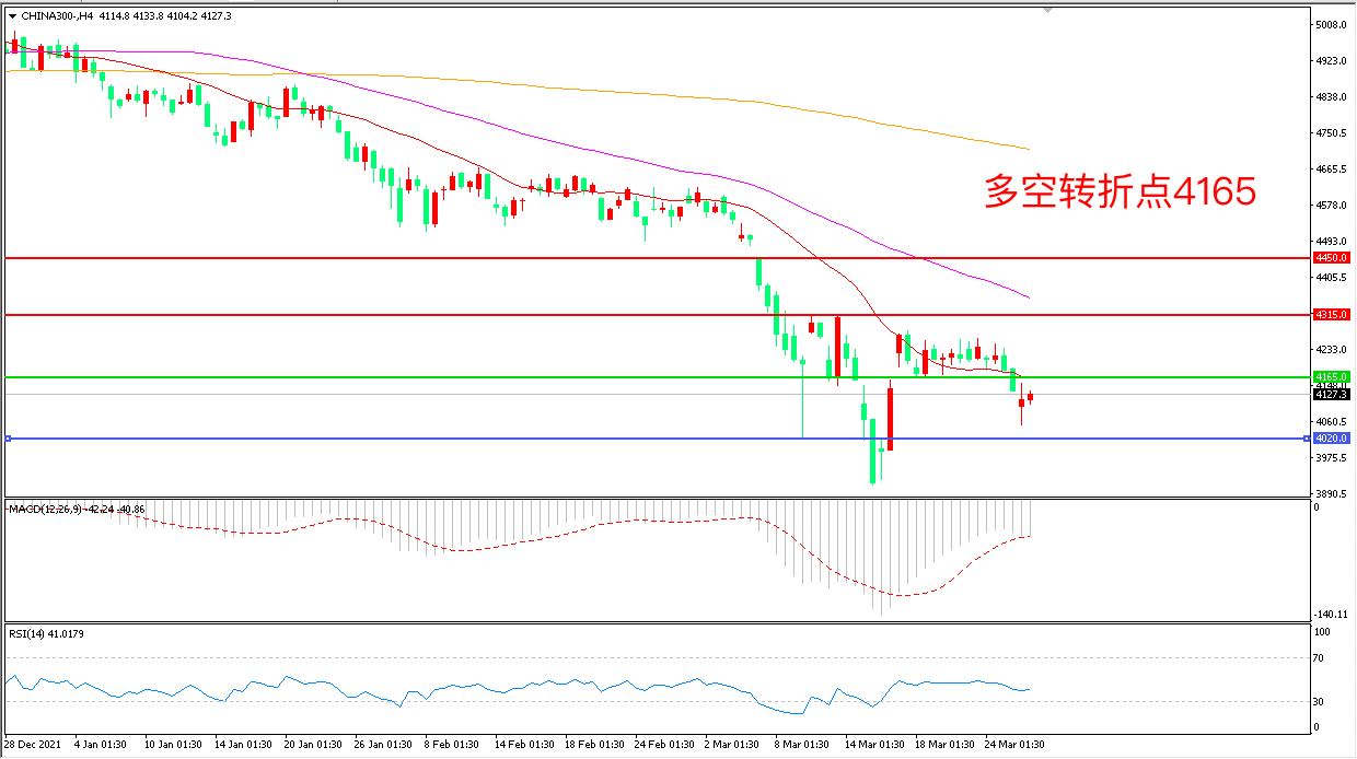 周一(3月28日),沪指低开低走,盘中一度跌超1%,随后在地产、金融等带动下小幅走高,沪深300先跌后涨,收报4127.3点。两市合计成交9000亿元,北上资金净买入50亿元。虽然指数今天在地产金融的护盘下,走的不算难看,但相关板块和个股冲高回落,说明资金做多动能不足,沪深300再度下行概率较大。