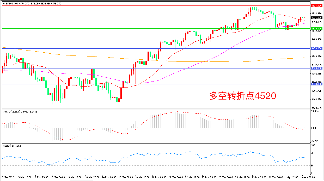 4小时图看,标普500回踩4520后再度拉升,短线行情回暖,均线系统走平,MACD红柱缩短,RSI指标走平,日内震荡上行概率较大。