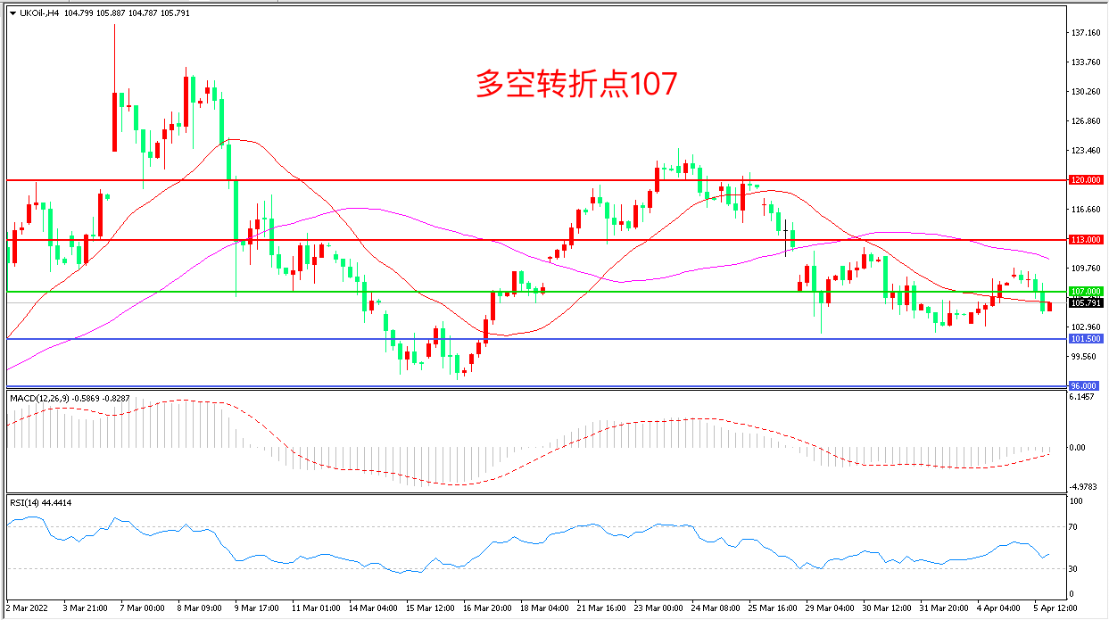 4小时图看,油价接近55周期均线后回落,横盘迹象明显,113美元成为阻力,101.5美元成为支撑,MACD红柱增加,RSI指标走平,日内延续震荡概率较大。