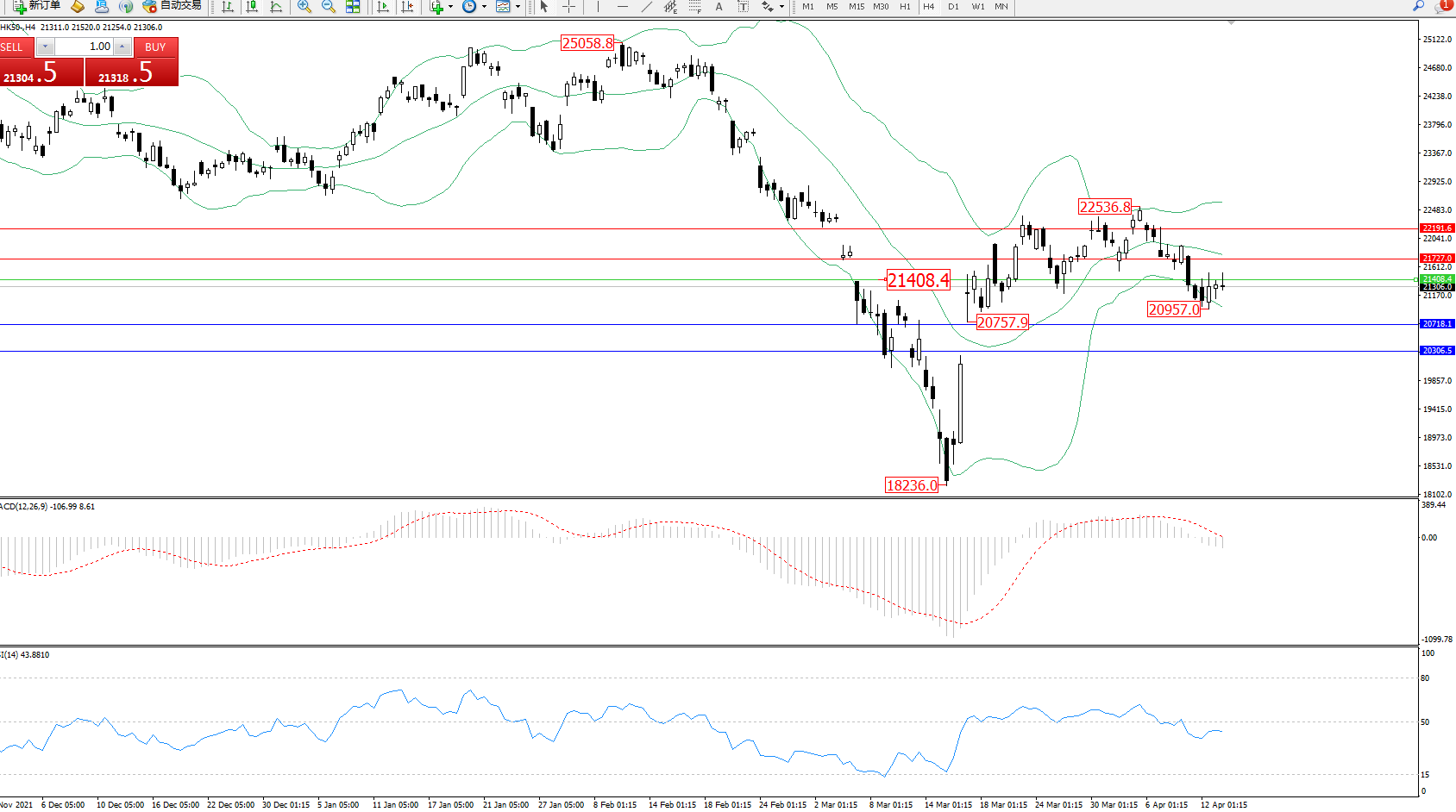 技术点评:高位空头动力维持震荡下行,低位抵达20957位置后开始整理,短期处于弱势徘徊中,低位多头动力有伺机入场迹象,但市场整体依旧处于弱势,布林带指标呈缓慢张口走势中,MACD指标处于0轴线下方弱势徘徊中, RSI指标处于50均衡线下侧弱势整理平移中;