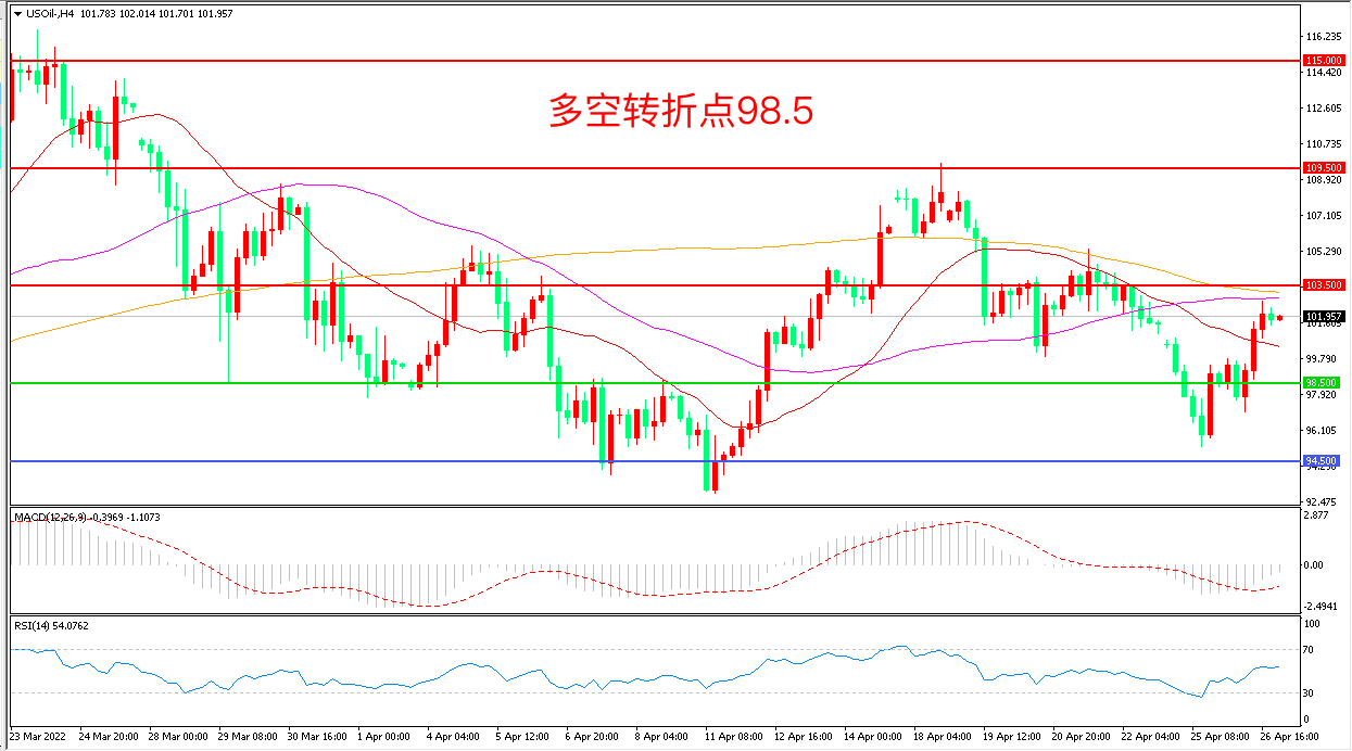周二(4月26日),莫斯科与欧洲各国在关键能源供应问题上的紧张关系出现重大升级,俄罗斯将在切断向波兰的天然气供应,市场担忧情绪推动美国WTI原油顺势反弹,收报101.93美元/桶。周三(4月26日),美国石油协会数据显示API美国原油累库487.4万桶,远超市场预期,如果晚间EIA表现与此一致,可能会对油价形成打压。