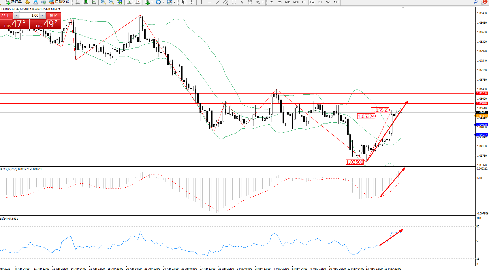 技术点评:低位多头动力强势反转震荡上扬,延续布林带指标上轨持续向上拉升中,高位抵达1.05565附近整理,布林带指标呈收口走势后开始逐渐张口,MACD指标低位多头动力强势震荡上扬至0轴线上方多头区域不断攀升,RSI指标处于50均衡线上側多头区域维持上移中;
