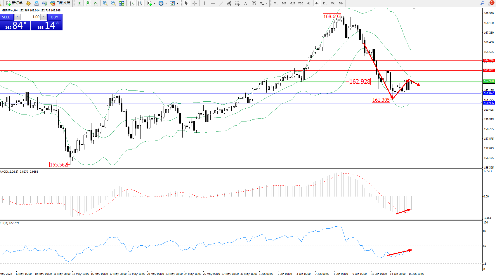 交易策略:162.928下方看跌,目标161.872、160.996
