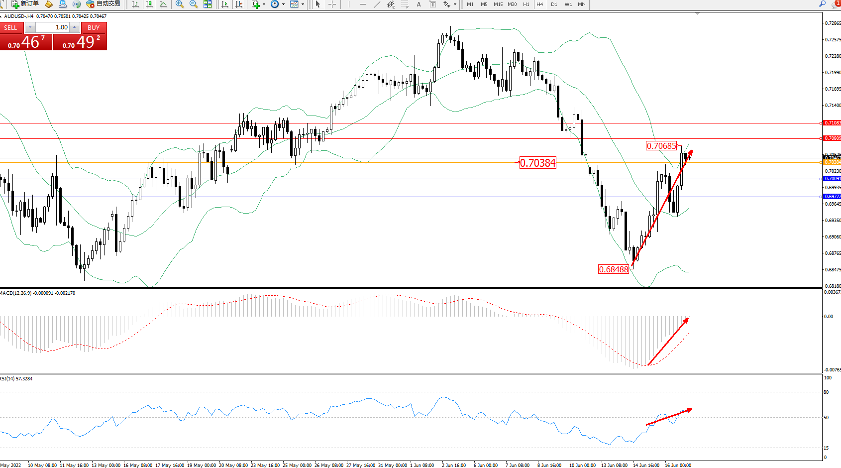 澳元兑美元维持0.70467附近震荡,澳大利亚5月强劲的就业形势几乎没有减弱的迹象,失业率维持在48年低点,凸显出澳洲联储保持快速加息的理由。