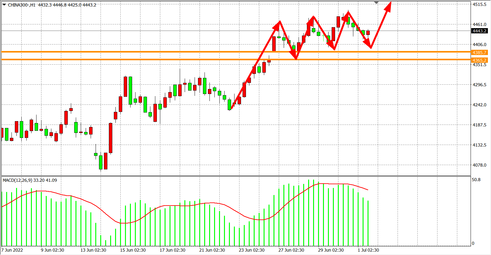 1小时图看,沪深300小幅回落但依旧处于支撑4385之上,同时MADC开始于零轴之上缩量,调整信号较为明显,但趋势仍处于多头格局,后市维持在4385之上继续以看涨为主,目标4500-4600