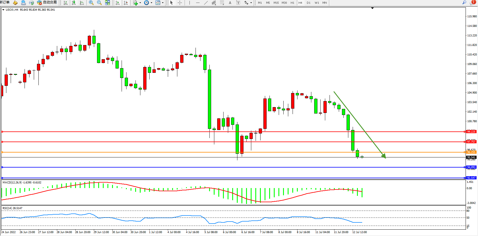 原油维持95.541附近震荡,截至7月8日当周,原油库存增加476.2万桶,远超预期的减少193.3万桶。疫情导致需求减少,以及对美国CPI数据的担忧,油价跌至3个月低点。