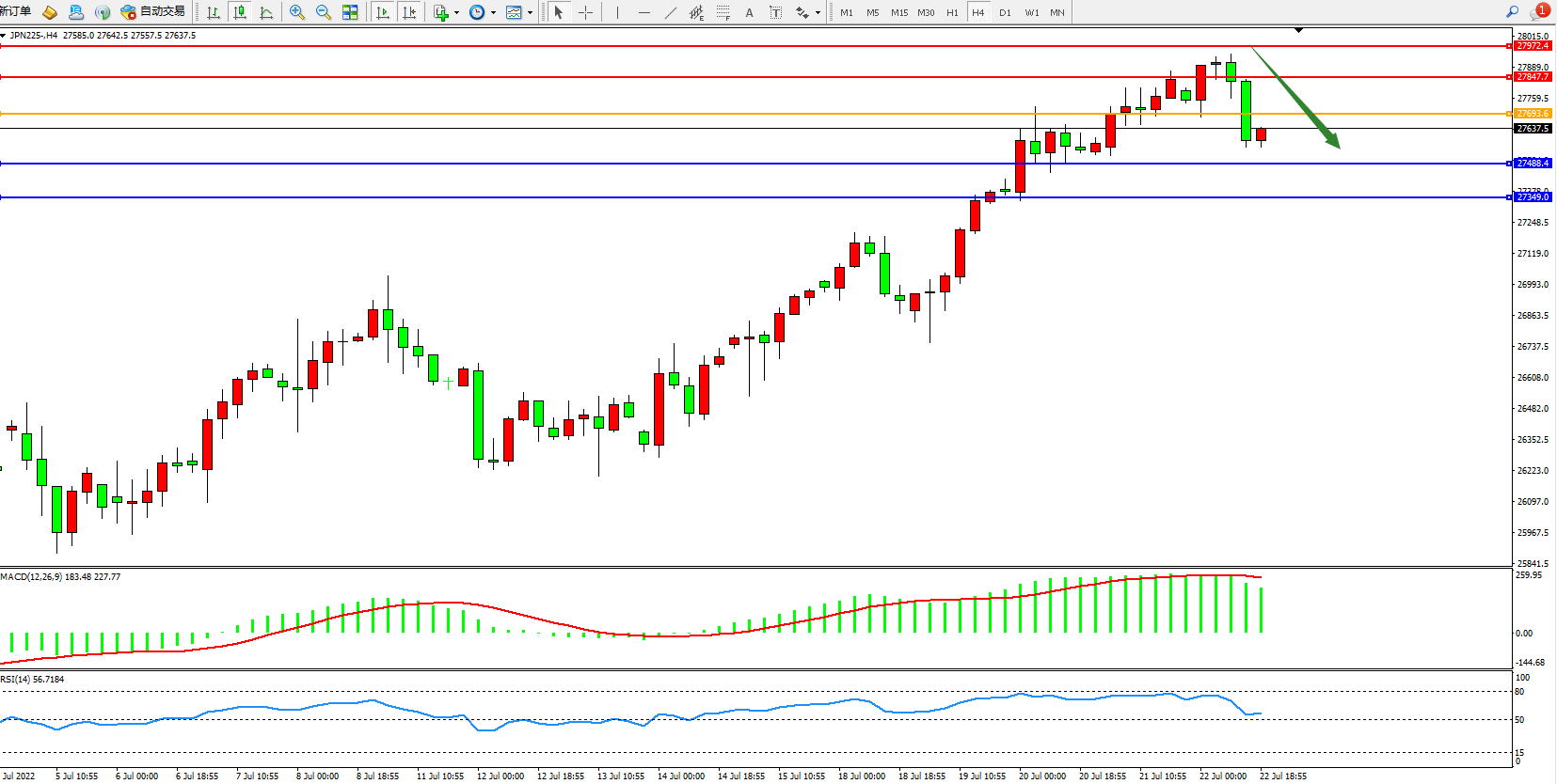 日经225指数7月22日(周五)收盘上涨110.50点,涨幅0.40%,报27913.50点。日本政府计划将2022财年的经济增长预期从1月的3.2%下调至约2%,此举是考虑到俄乌冲突和新冠疫情管控措施等因素造成的全球经济不确定性加剧。日本政府还担心价格上涨导致消费放缓以及新冠疫情卷土重来。