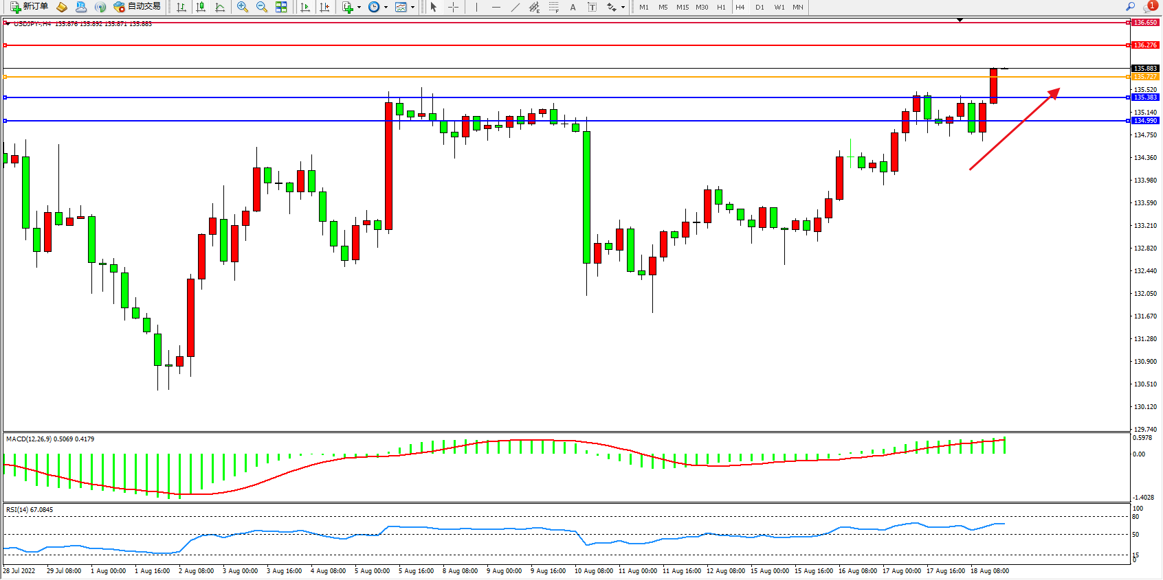4小时图看:多头动力维持震荡上扬态势良好,短期突破前期高位后不断攀升,市场看涨情绪持续,MACD指标处于多头区域维持整理上移,RSI指标处于多头区域弱势上行;