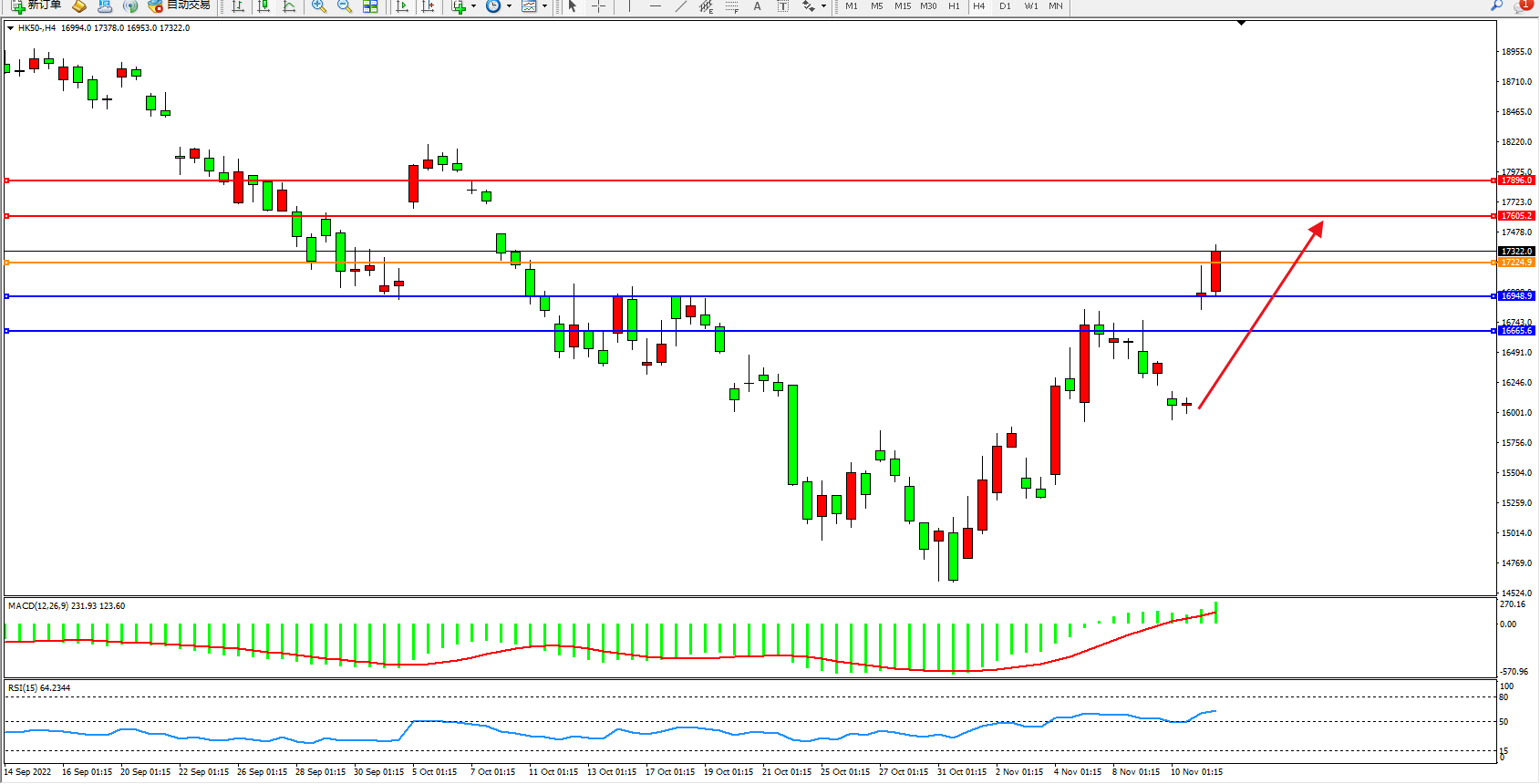 香港恒生指数11月11日(周五)收盘上涨1244.62点,涨幅7.74%,报17325.66点;美国通胀数据弱于预期,料美联储放慢加息步伐,叠加午后国家卫健委发布最新防疫措施公告。港股全天呈现暴涨行情,恒生科技指数“涨停”10.05%,上涨超300点,恒指涨7.74%上扬超1200点,国指涨8.31%,三者皆创反弹新高。国家卫健委发布《关于进一步优化新冠肺炎疫情防控措施 科学精准做好防控工作的通知》。其中明确提出,将风险区由“高、中、低”三类调整为“高、低”两类,最大限度减少管控人员。