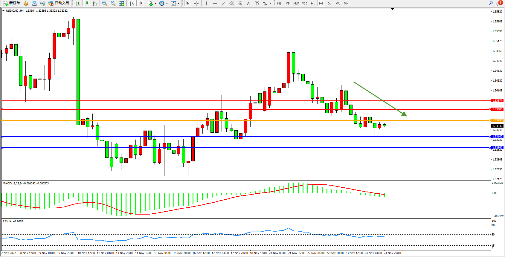 美元加元USDCAD——4小时K线图显示:
