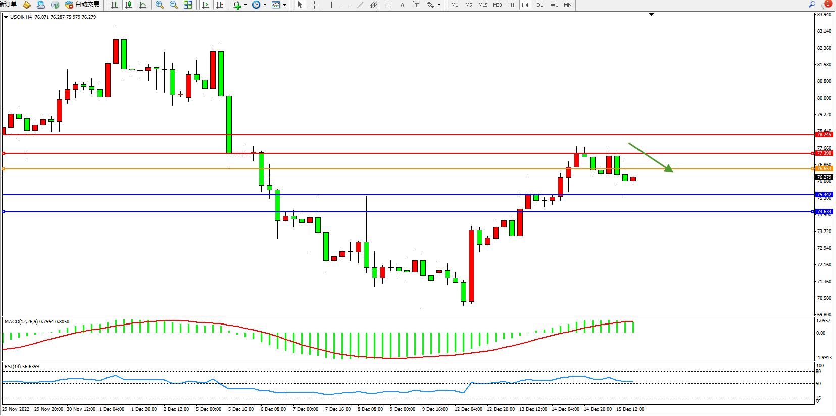 4小时图看:高位短期整理,空头动力有伺机入场下移迹象,高位空头情绪伺机涌现,MACD指标处于多头区域整理,RSI指标处于50均衡线上側弱势徘徊;