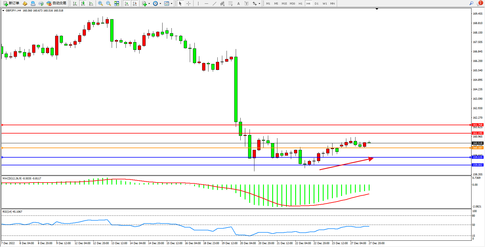 4小时图看:低位维持窄幅震荡缓慢上行,短期多头动力有伺机入场迹象,MACD指标处于空头区域整理上移,RSI指标处于50均衡线下侧弱势徘徊中;