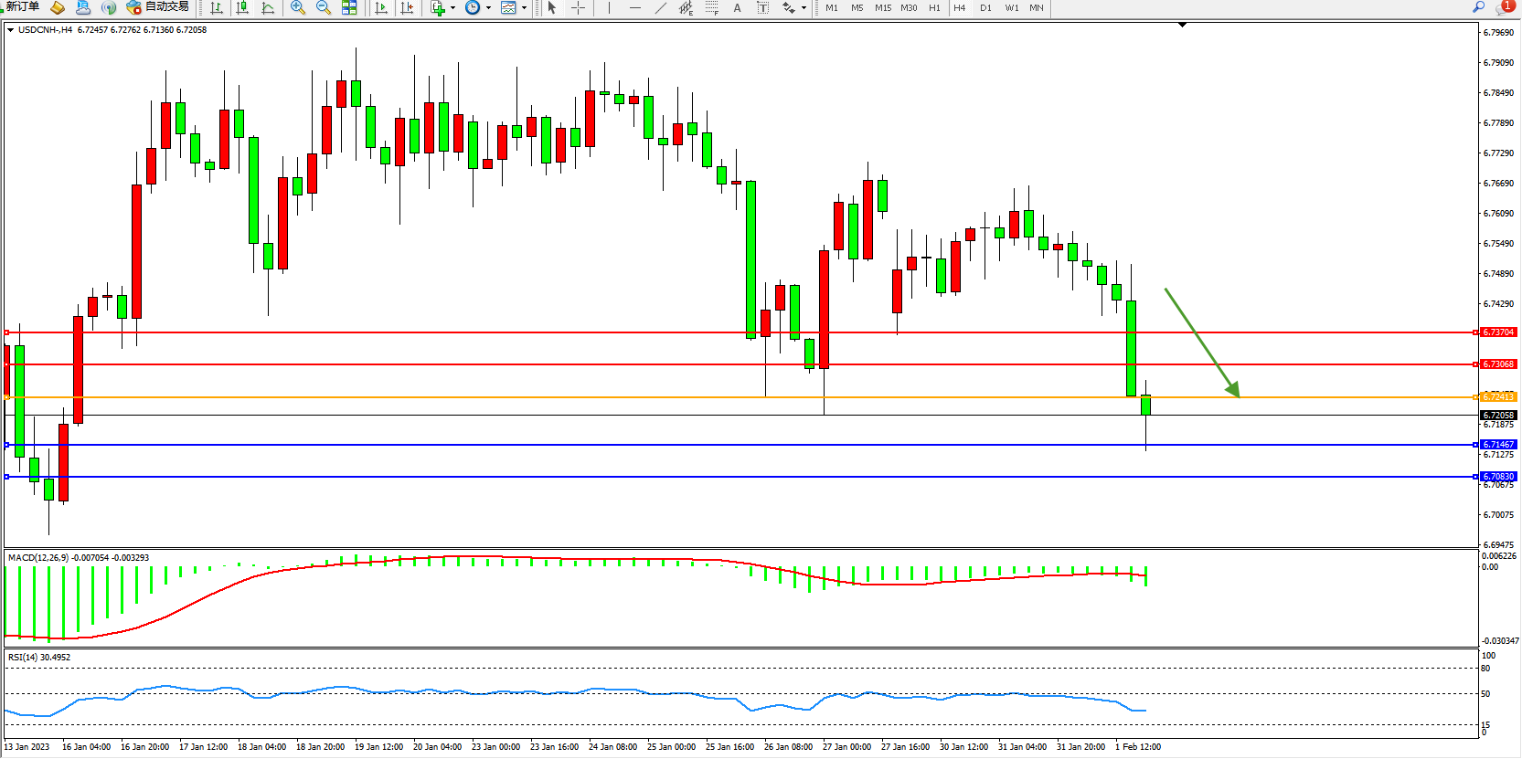 交易策略:6.72413下方看跌,目标6.71467、6.70830