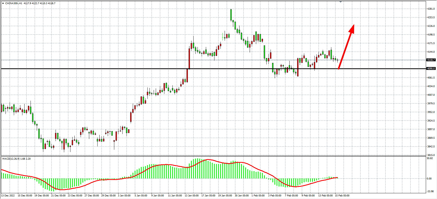 4小时图看,沪深300在反弹4150之后受阻明显,但趋势整体仍偏上行,同时MACD于零轴之上开始小幅放量,当前支撑关注4090,在该位之上继续维持看涨,上方目标4150-4200附近。