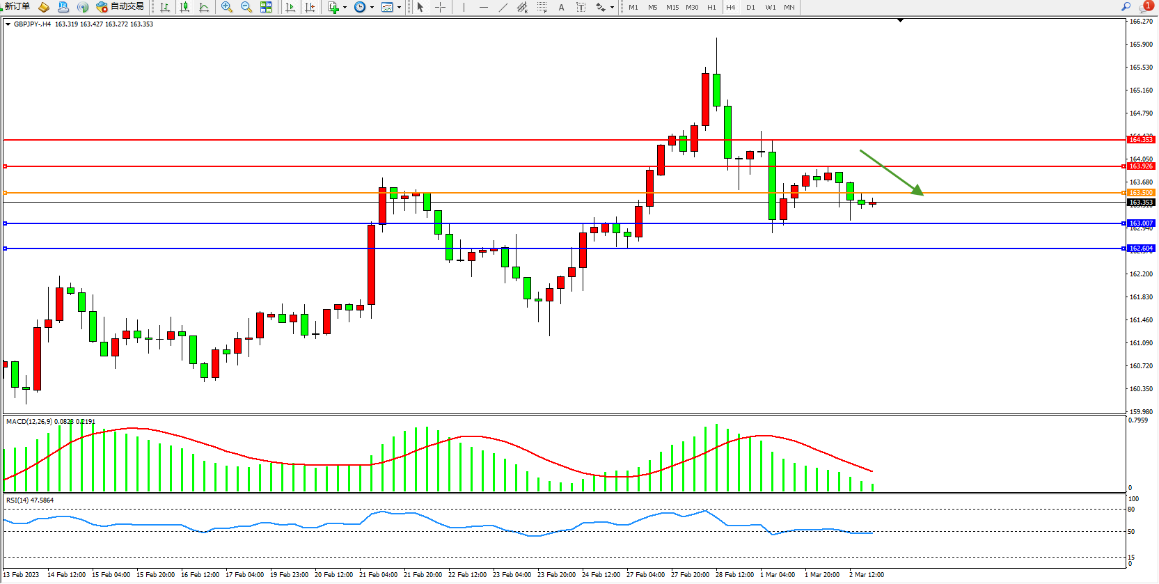 4小时图看:空头动力弱势震荡下移,短期跌势或将延续,市场处于偏弱势向下移动中,MACD指标处于高位震荡下行,RSI指标处于50均衡线下侧徘徊;
