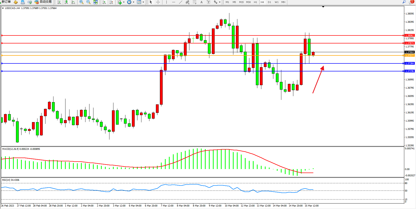 4小时图看:多头动力强势拉升上扬,短期看涨情绪涌现,市场多头不断向上移动后震荡,MACD指标处于空头区域整理上移至0轴线附近徘徊,RSI指标处于50均衡线上側整理;