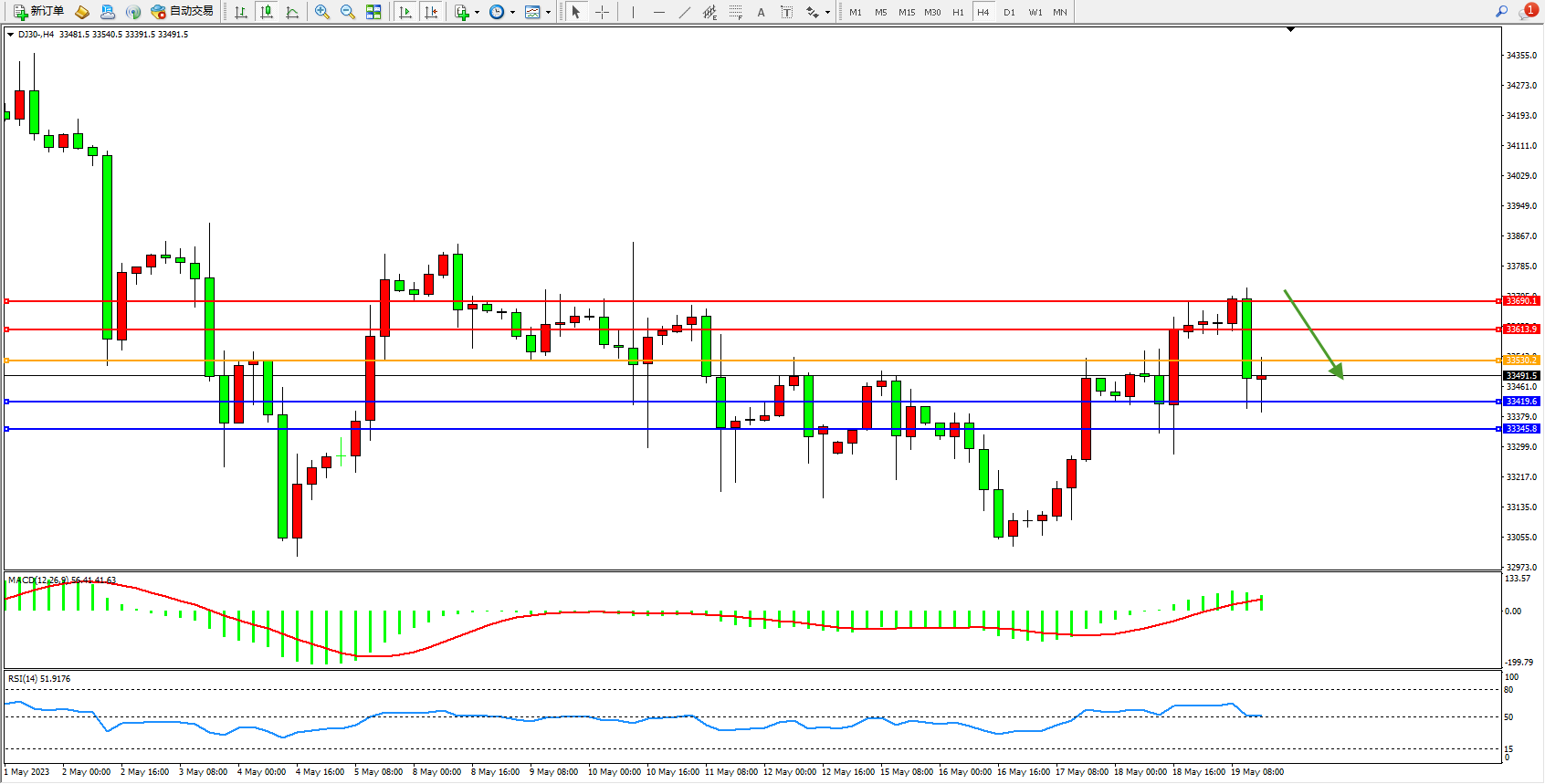 道琼斯指数5月19日(周五)收盘下跌109.48点,跌幅0.33%,报33426.43点;美联储主席鲍威尔讲话采取了适度鸽派的立场,与市场预期相反。他称鉴于信贷条件收紧的情况,美联储可能不需要加息那么多。