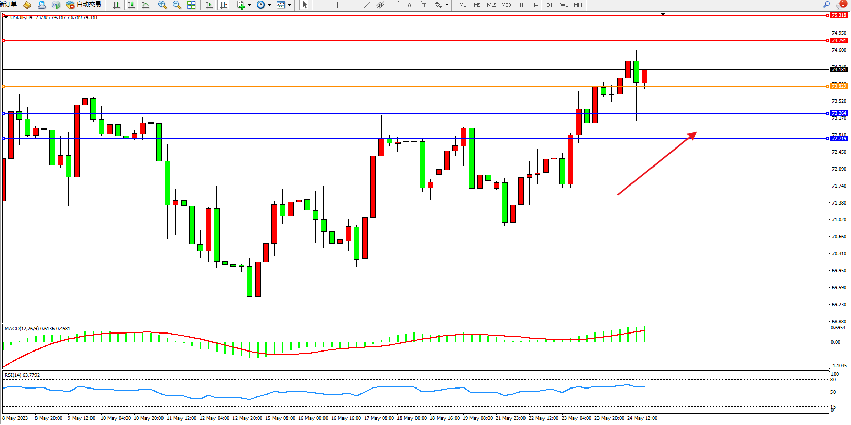 交易策略:73.829上方看涨,目标74.791 75.318