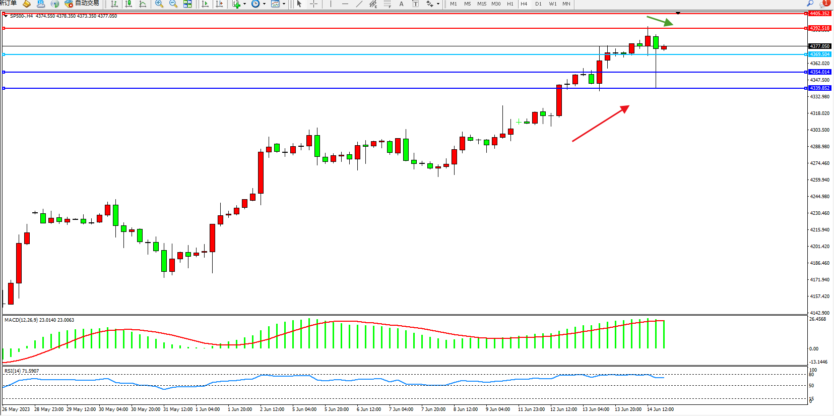 标普500指数6月14日(周三)收盘上涨3.51点,涨幅0.08%,报4372.52点;美联储将贴现利率维持在5.25%不变。美联储称,进一步收紧政策的力度将取决于经济状况。美联储将继续以相同的速度减少国债和住房抵押贷款支持证券持有量。