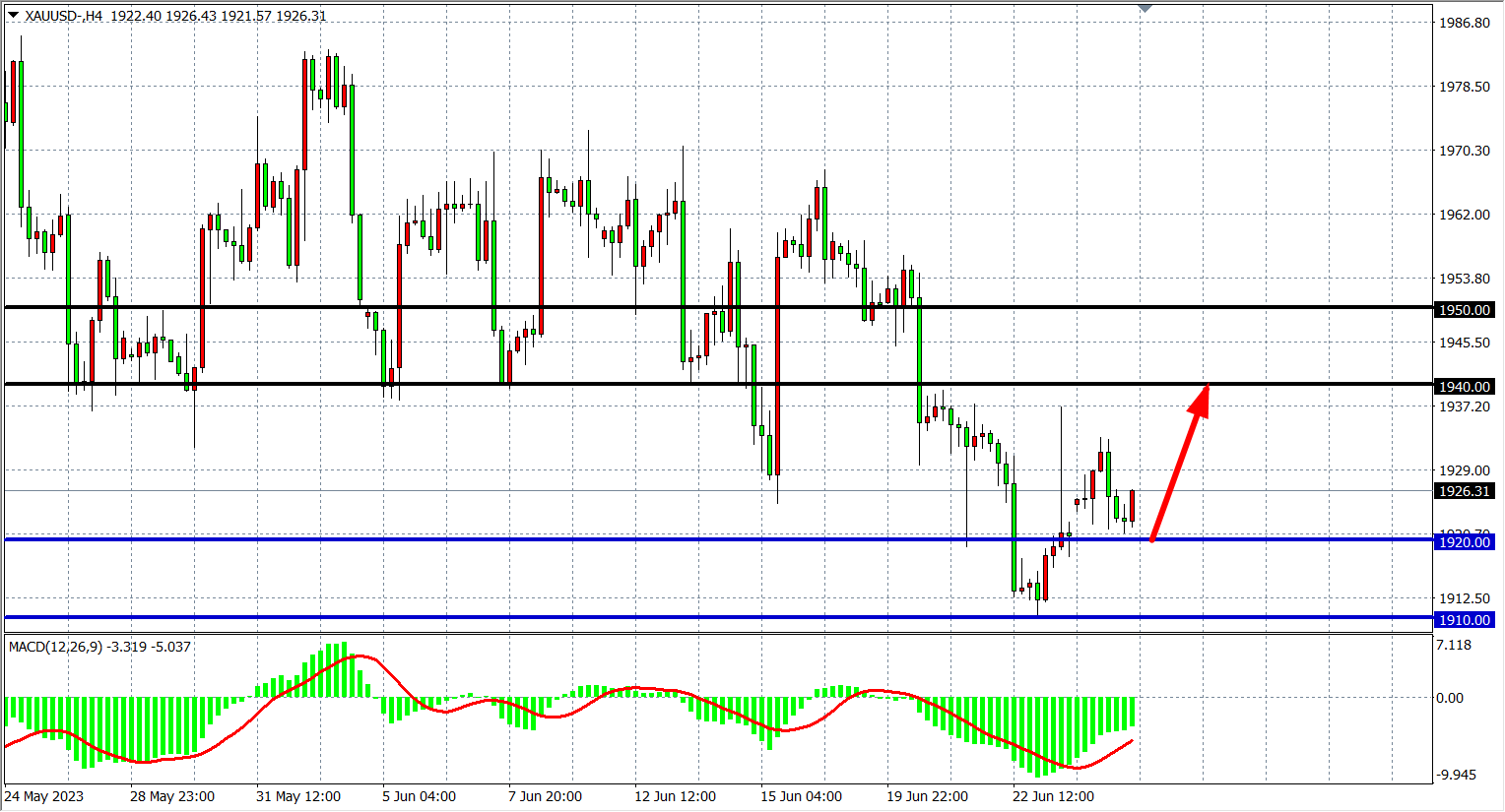 周一(6月26日)现货黄金一度上破1930美元但未能站稳,最终收涨0.11%