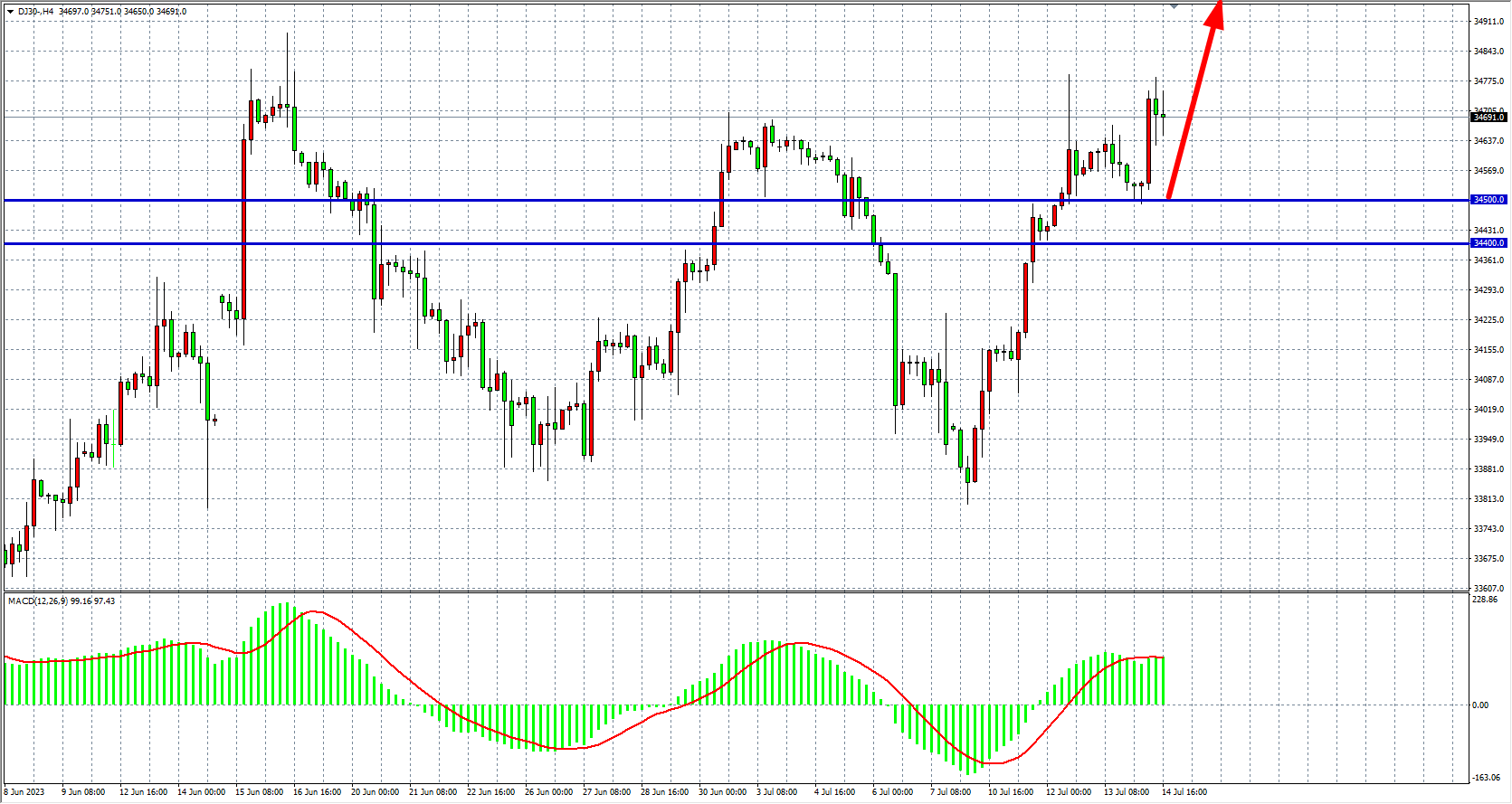 4小时图看,道指在34500之上继续走高,MACD量能维持零轴上放量,支撑继续关注34400-34500附近,阻力34800-35000。