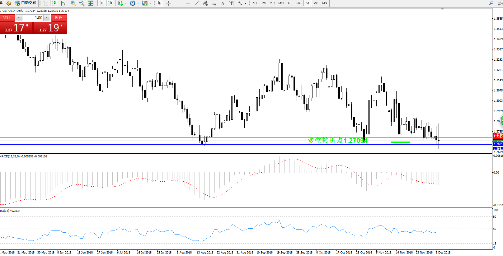 技术点评:受市场资讯影响,近期波幅较大,空头情绪隆重,目前正试图下破底部双底位置,MACD指标0轴线下行空头区域延续平缓移动,RSI指标50均衡线下方弱势整理;