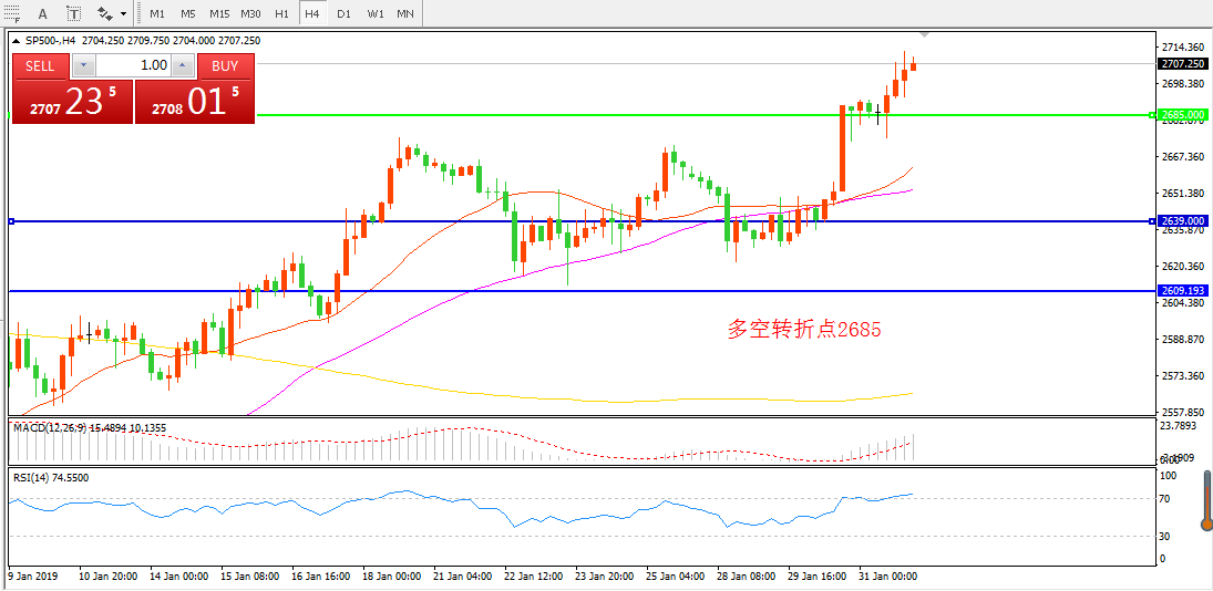 4小时图看,SP500短暂回调后大幅上行,均线逐渐粘合,MACD红柱增长,亚盘时段预计有所回调,重点关注2645附近支撑。