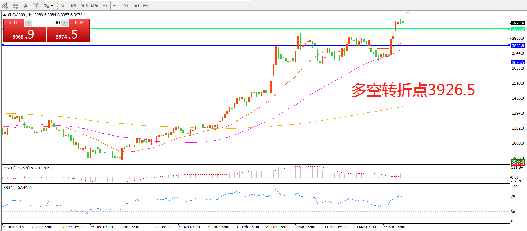 4小时图看,中华指数CHINA300以55均线为依托,强势上行,虽有小幅落,但整体涨势不改。 MACD红柱增加,RSI指标拐头走平,多头趋势依然明显,日内延续上升概率较大。