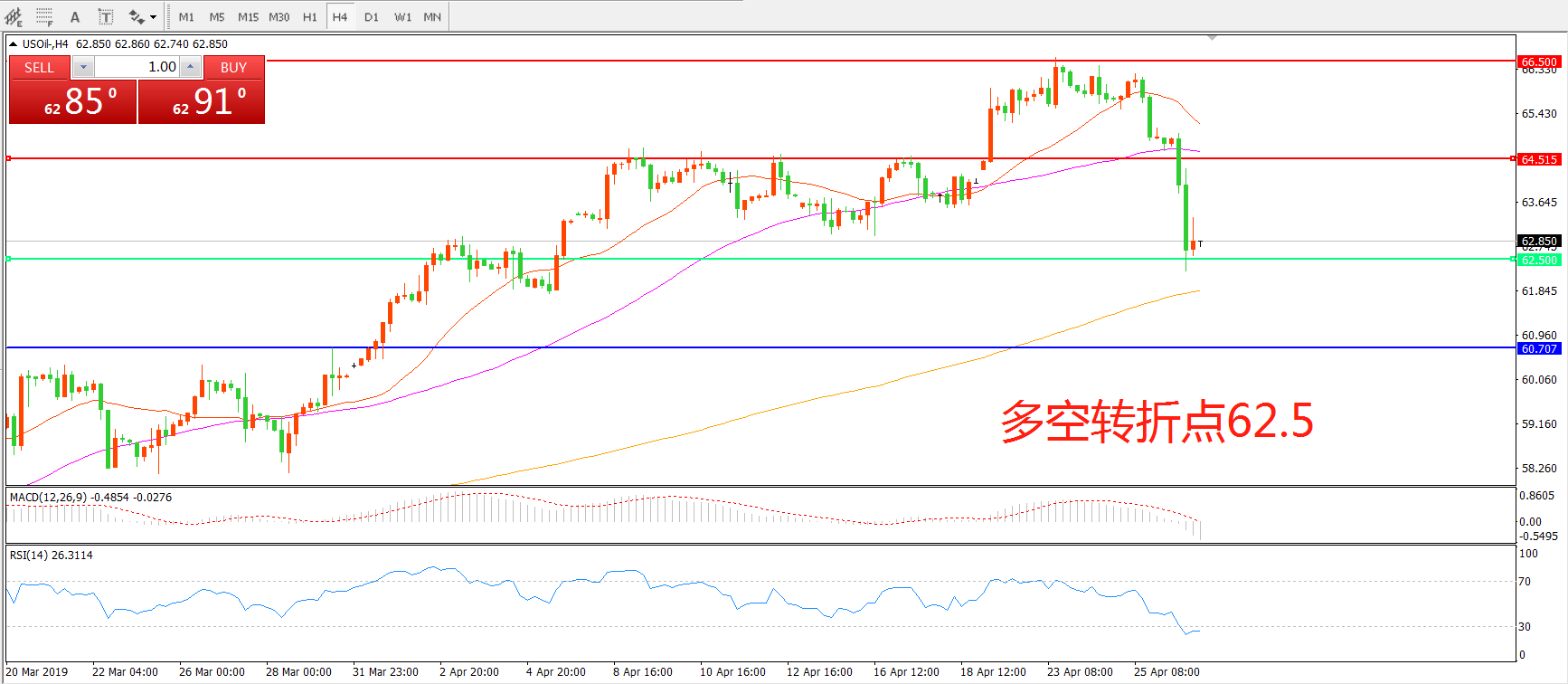 4小时图看,油价连续下行,跌破21、55均线两道关口,整体走势偏弱,但200均线逐渐上移,有可能形成支撑,MACD红柱减少,绿柱增加,RSI指标拐头向上,日内重点关注62.5一线支撑。