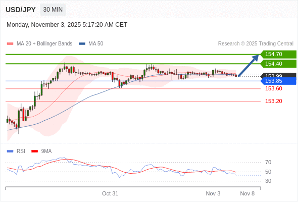 在 153.85 之上,看涨,目标价位为 154.40 ,然后为 154.70 。
