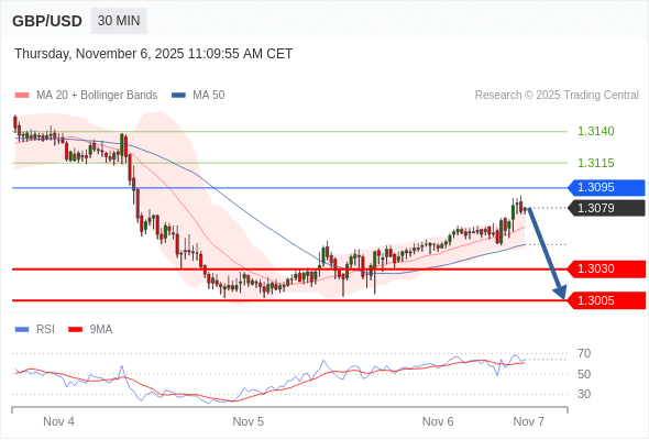 在 1.3095 之下,看跌,目标价位为 1.3030 ,然后为 1.3005 。