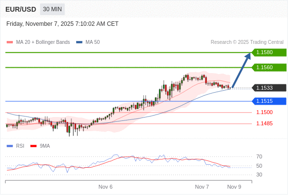 在 1.1515 之上,看涨,目标价位为 1.1560 ,然后为 1.1580 。